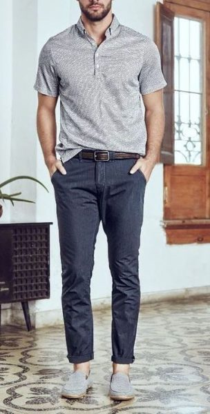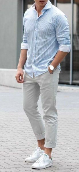 Wearing a belt with your chinos is optional. You’ll notice in some photos guys are wearing tucked in shirts without a belt, this works fine for a casual look. Not wearing a belt when wearing monochromatic colors streamlines the body and makes you look taller.