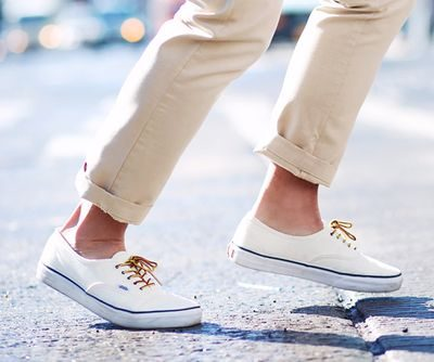 You can wear no-show socks with everything from dress shoes to sneakers. However, skip the no show sock look for formal occasions. The example below is an easy look to try as a stepping stone to wearing cuffed chinos and no show socks. The casual look with fresh white sneakers and a rolled up button down is perfect for testing out on the weekend or on vacation.