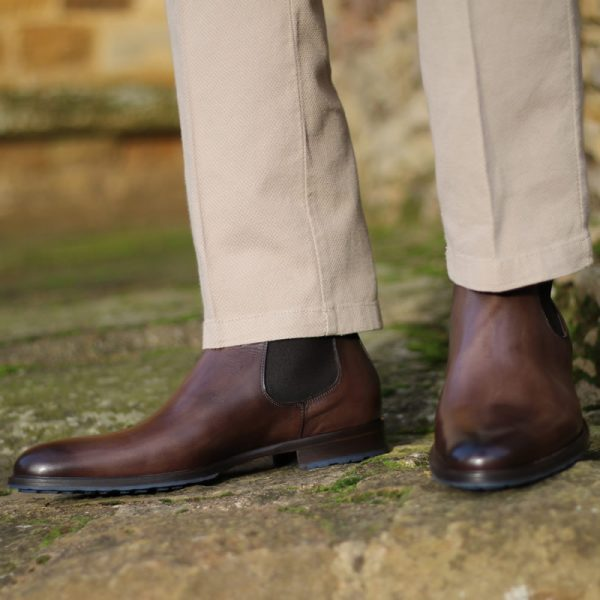 If your boots are slim at the ankle, you can wear your chinos over your boots for a clean and classic look. Make sure the chino fits comfortable over the boots. When wearing boots with chinos, multiple breaks will naturally occur and it’s okay.