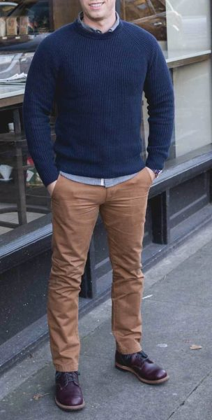 Some chinos come with a vertical crease at the front of the pants, which makes them more dressy. Wearing creased chinos with a casual outfit like a t-shirt and sneakers will throw off the look, so stick to a dress shirt, button down, or sweater if going for the crease.